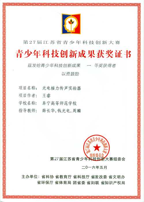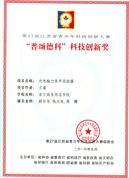 我校王睿、庞浩、程爽三同学在薛长华、裴曙光、周麟、钱光电等老师的指导下,在第27届江苏省青少年科技创新大赛中荣获喜人成绩。王睿《光电接力传声实验器》获得科技创新成果一等奖、“普颂德科”科技创新奖;庞浩《螺线管电磁炮演示模型》获得科技创新成果三等奖;程爽《电磁炉电磁感应实验器》同时获得科技创新成果三等奖。