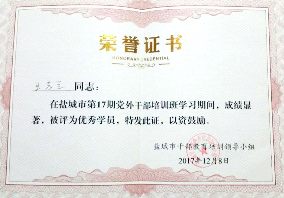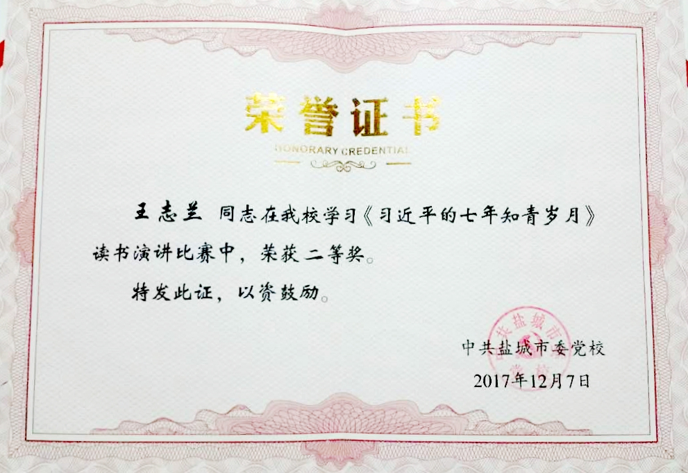 图书馆王志兰老师于2017年11月14日至12月8日在中共盐城市委党校参加盐城市第17期党外干部培训班学习,学习期间,王老师遵守纪律,勤奋学习,积极参加各项学习交流研讨活动,在党校组织的学习《习近平的七年知青岁月》读书演讲比赛中荣获二等奖(第三名)。学习结束时,因王老师学习期间的出色表现和优异成绩,她又被评为优秀学员。图书馆人将以王志兰老师为榜样,以多种形式加强学习培训,不断提高服务能力和水平。