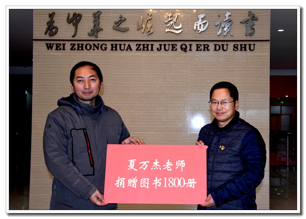 近日,我校教务处副处长夏万杰老师将自己多年购买精心收藏的1800册图书无偿捐赠给学校图书馆,以表达对书香校园及臻美至善精神文化建设的支持,得到了校领导的高度肯定。