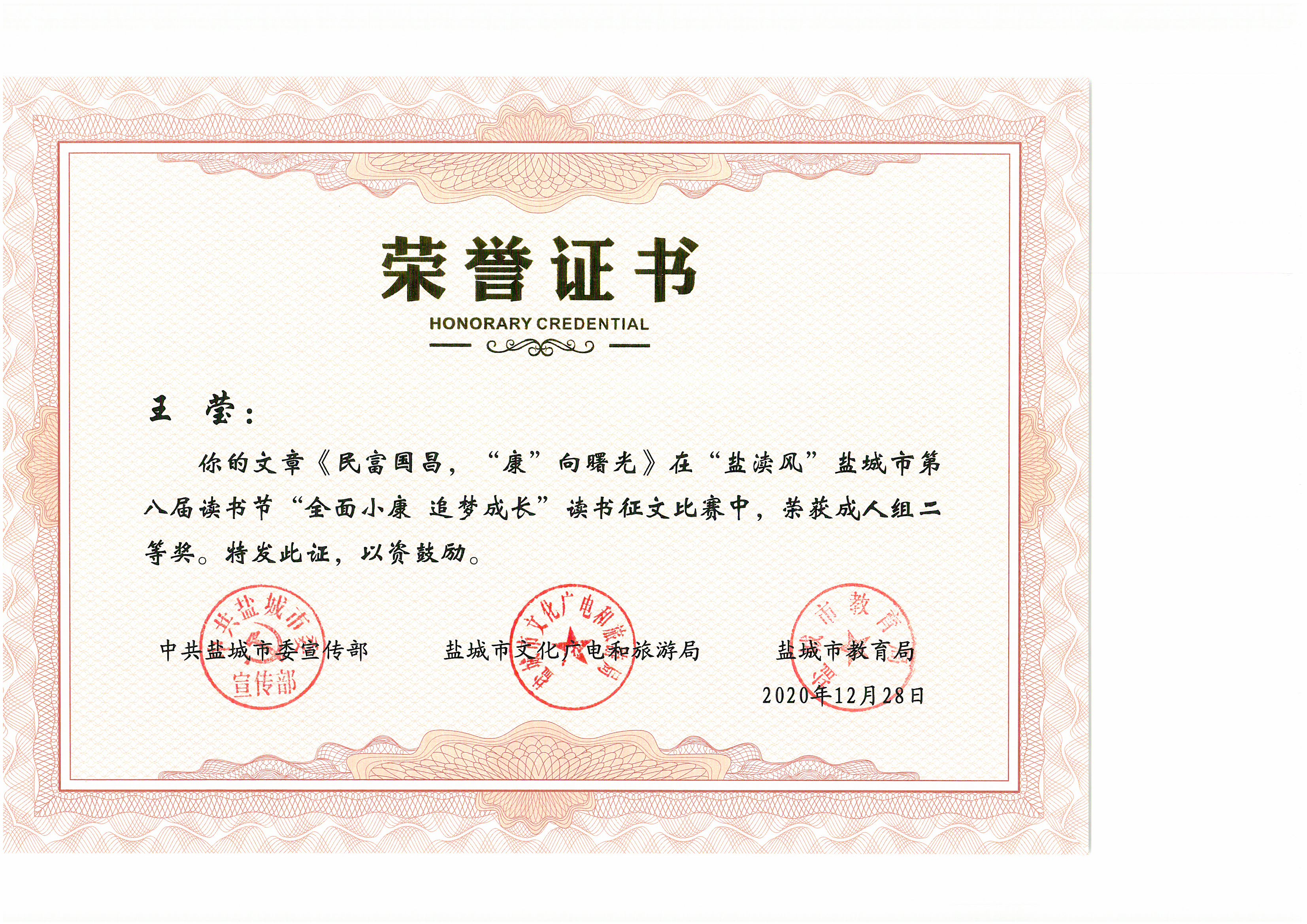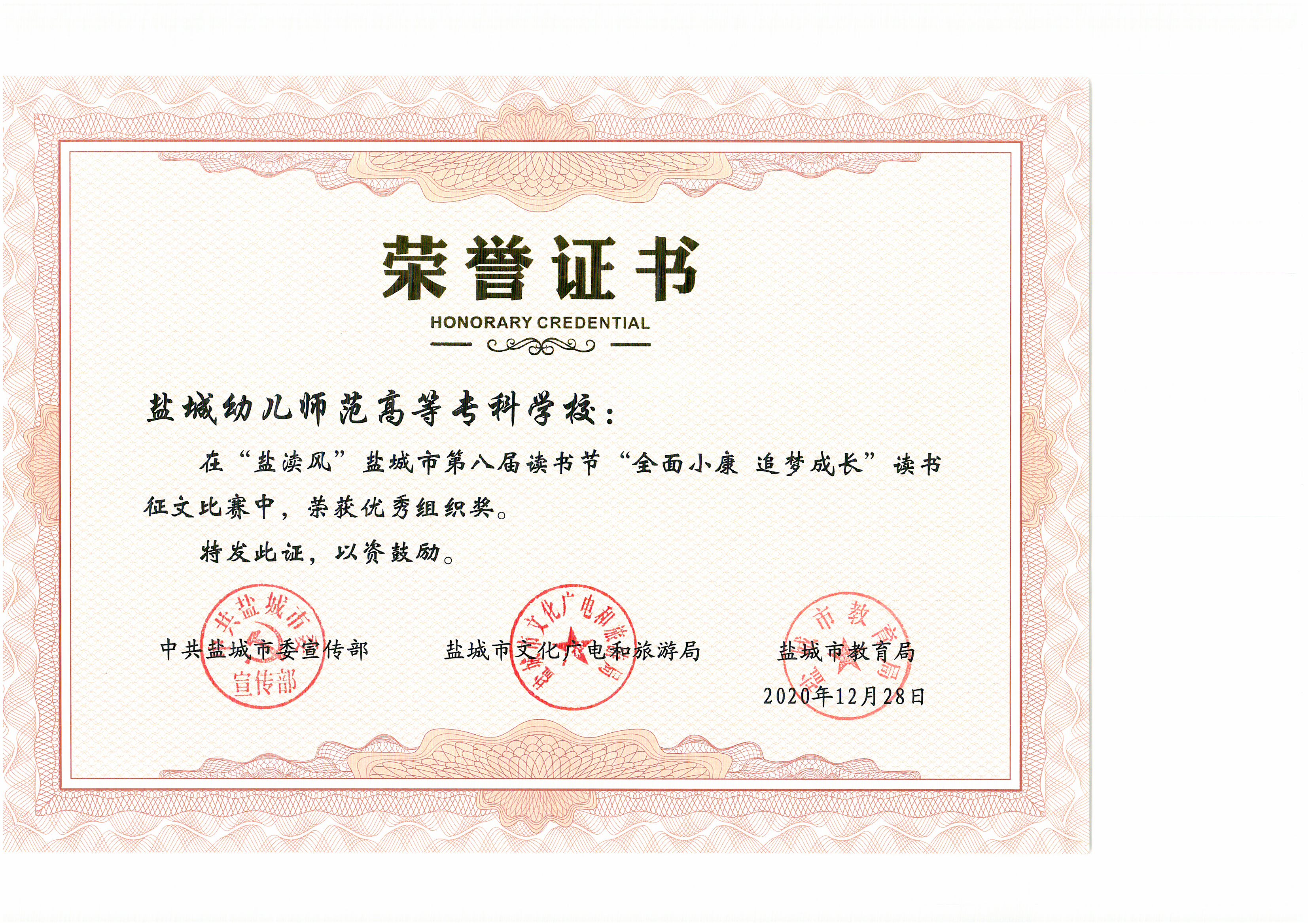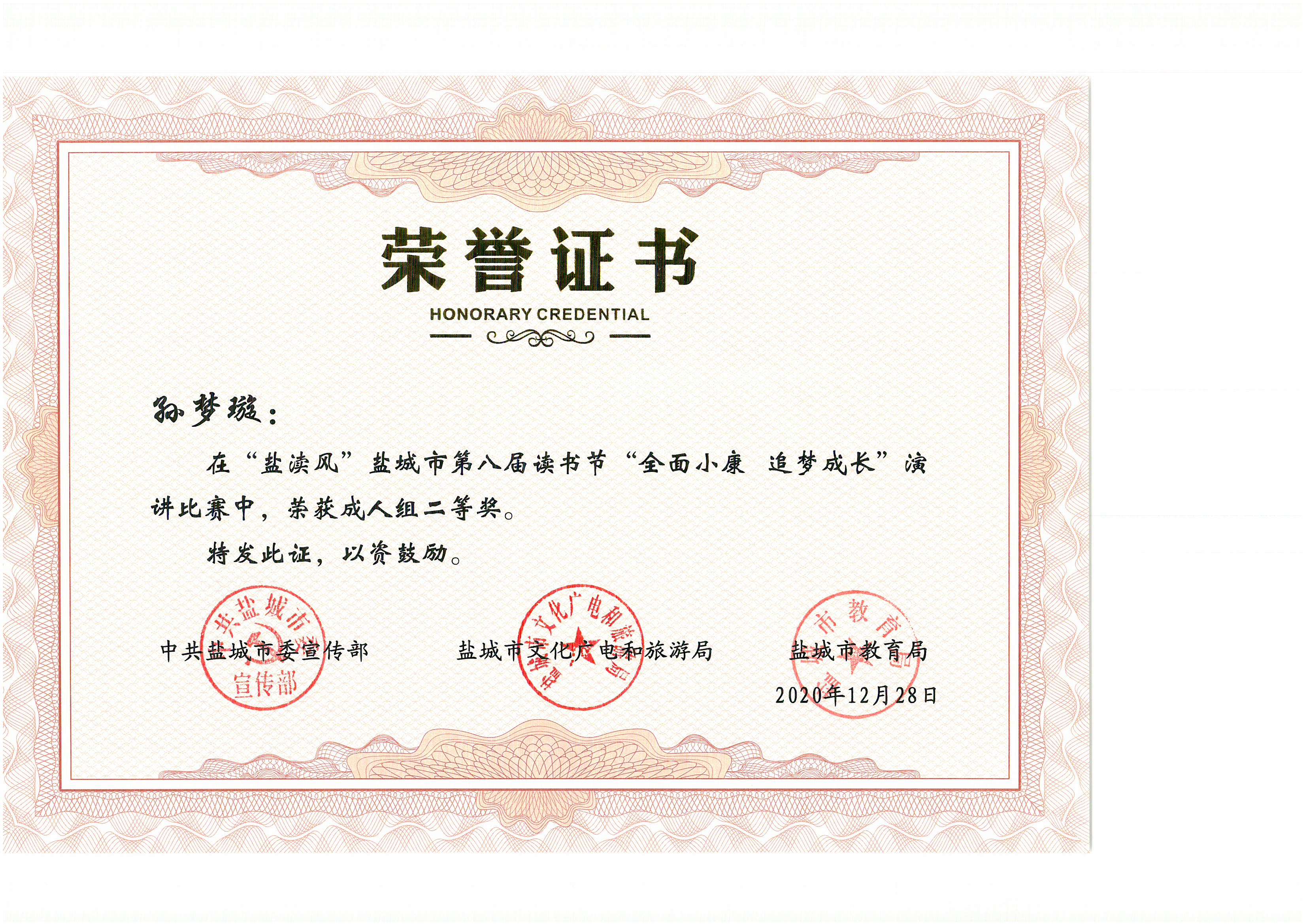 在中共盐城市委宣传部、盐城市文化广电和旅游局、盐城市教育局联合主办的 “盐渎风”盐城市第八届读书节活动中,我校参赛师生荣获一等奖1名,二等奖4名,学校获得2项优秀组织奖。在演讲比赛活动中,孙梦璇同学与县市区选送的十位选手同台竞技,喜获二等奖。特向获奖师生表示祝贺!