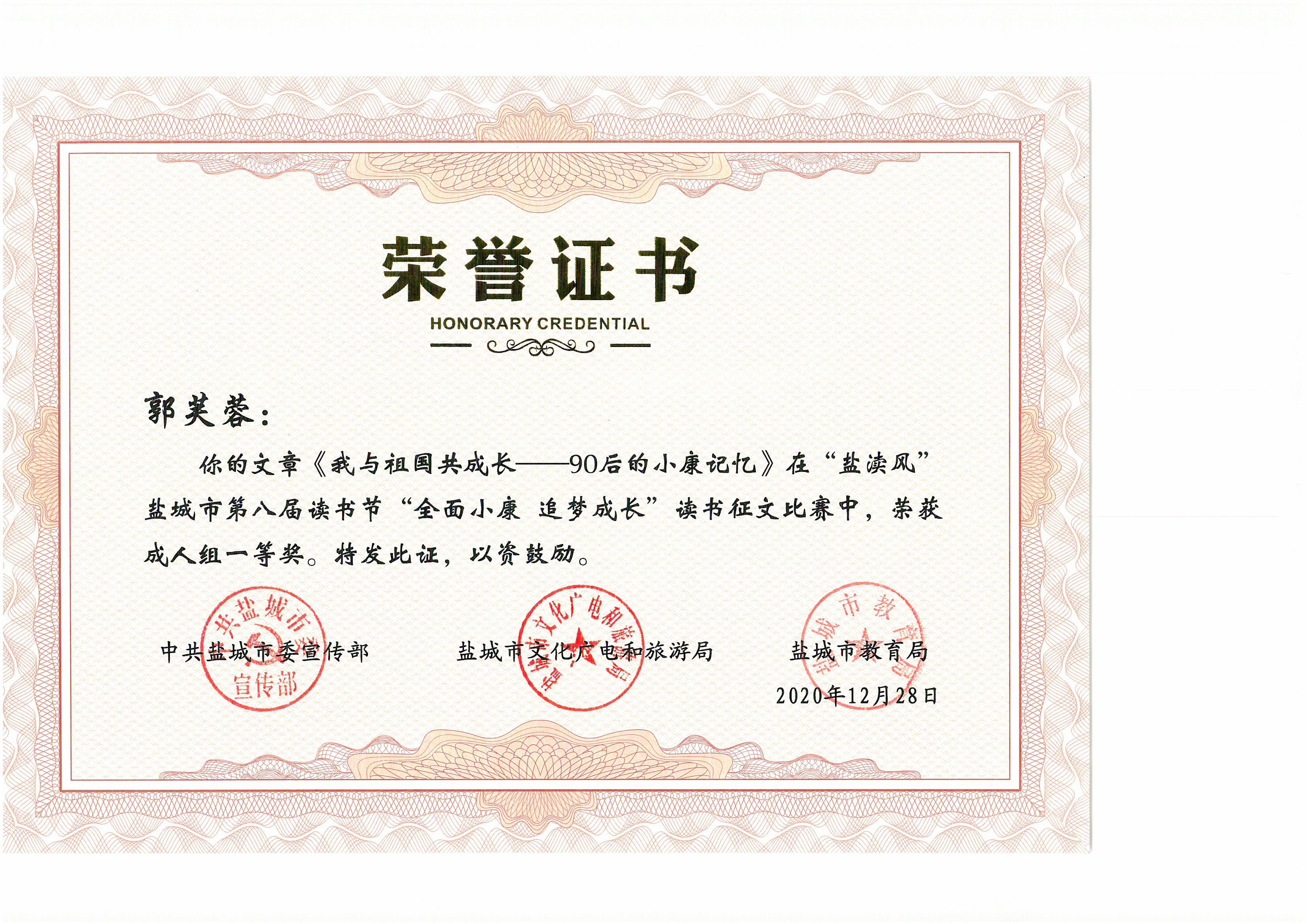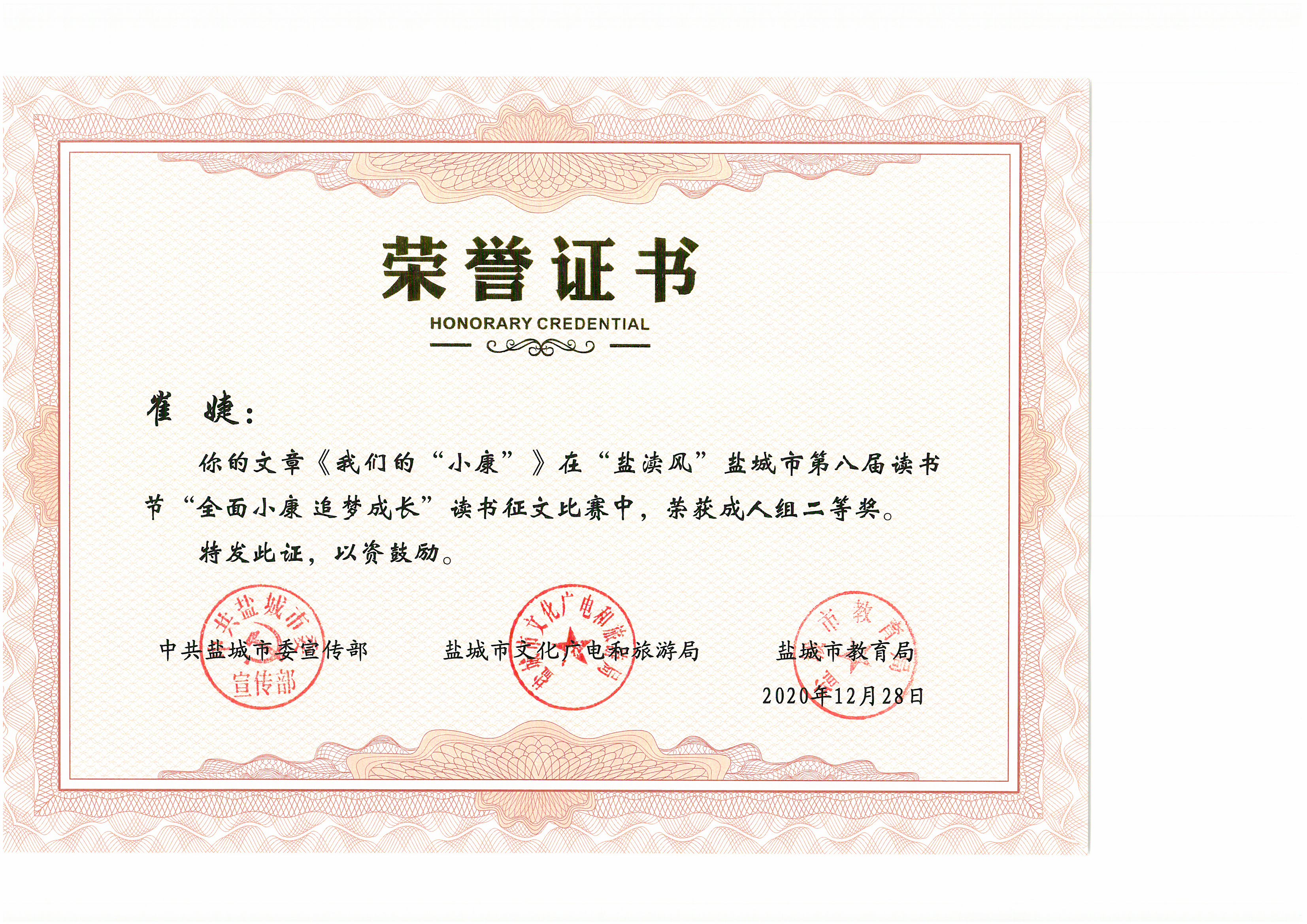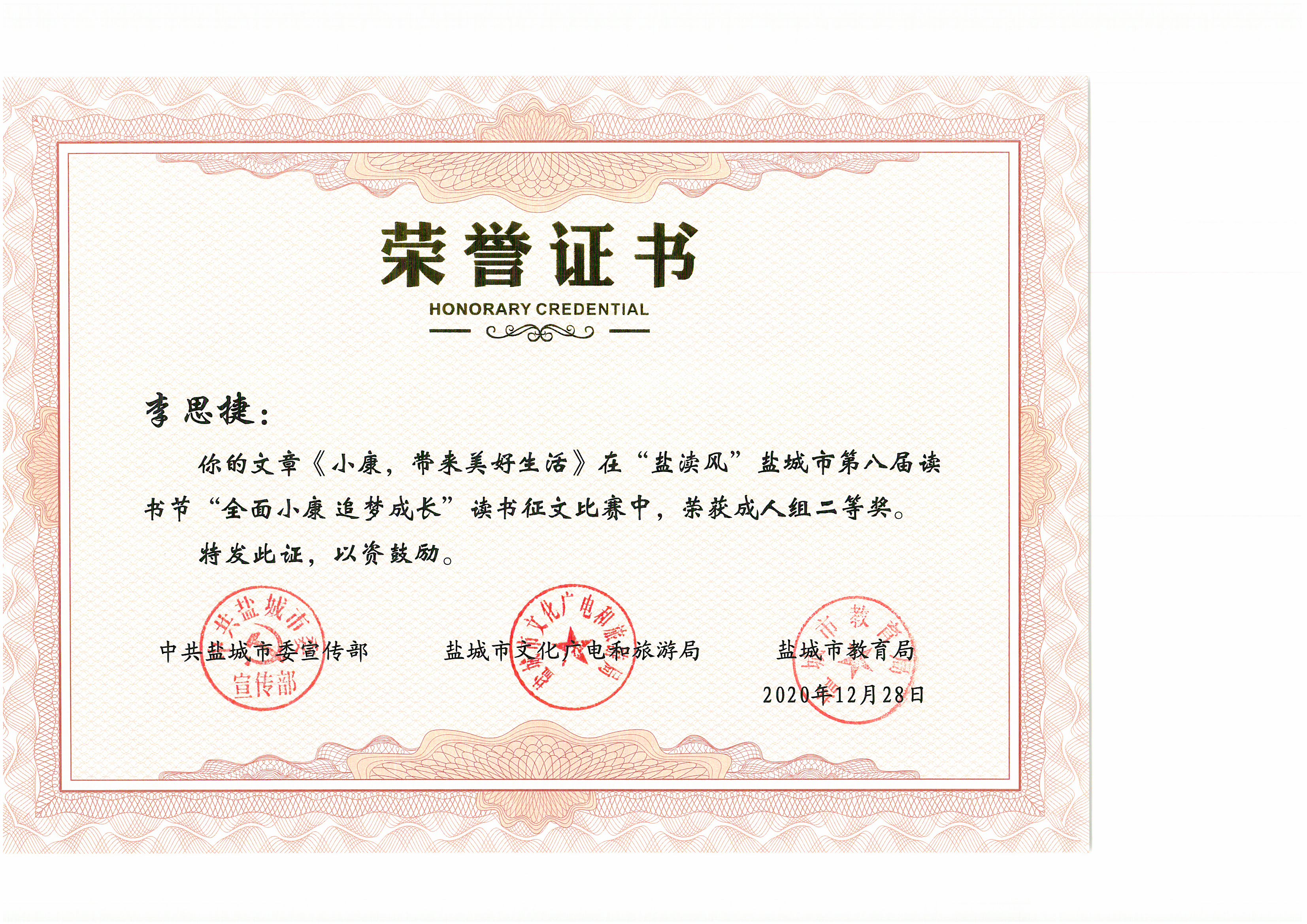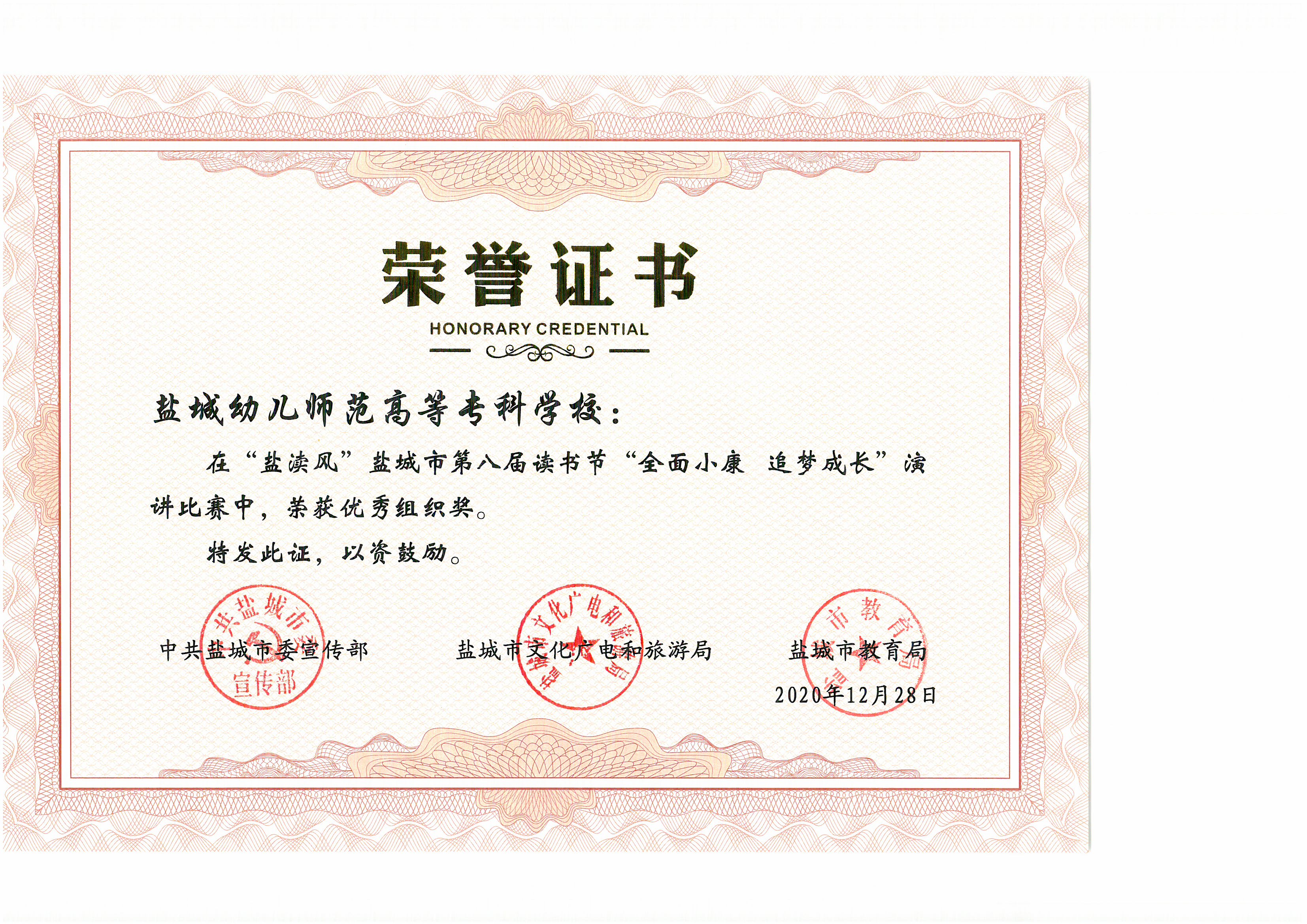 在中共盐城市委宣传部、盐城市文化广电和旅游局、盐城市教育局联合主办的 “盐渎风”盐城市第八届读书节活动中,我校参赛师生荣获一等奖1名,二等奖4名,学校获得2项优秀组织奖。在演讲比赛活动中,孙梦璇同学与县市区选送的十位选手同台竞技,喜获二等奖。特向获奖师生表示祝贺!